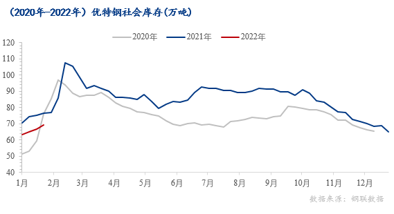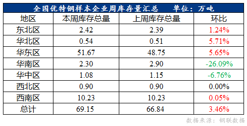 全國優(yōu)特鋼棒材樣本總庫存69.15萬噸,環(huán)比上升2.31萬噸,增幅3.46%。
