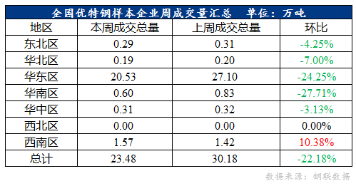 全國優(yōu)特鋼棒材樣本企業(yè)成交量23.48萬噸,環(huán)比下降6.7萬噸,降幅22.2%。