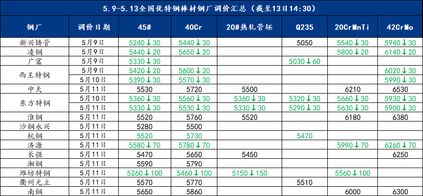 5.9-5.13全國主要優(yōu)特鋼廠調(diào)價(jià)情況如下:本期共有15家鋼廠發(fā)布調(diào)價(jià)信息,累計(jì)發(fā)布調(diào)價(jià)信息17次。本期鋼廠調(diào)價(jià)鋼廠價(jià)格下調(diào)為主,下周應(yīng)持續(xù)關(guān)注消費(fèi)需求及鋼廠檢修的影響。
