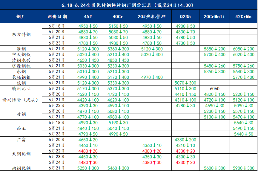 6.18-6.24全國主要優(yōu)特鋼廠調(diào)價情況如下:
