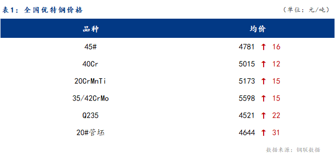 6月29日全國市場優(yōu)特鋼價(jià)格小幅上漲,45#碳結(jié)圓鋼Ф29-85全國均價(jià)報(bào) 4781元/噸,上漲16元/噸。主導(dǎo)市場杭州庫提4720元/噸,無錫庫提4740元/噸,山東直發(fā)4690元/噸。期貨盤面震蕩上行,市場成交尚可。