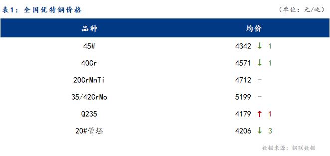 17日全國市場優(yōu)特鋼價格小幅下跌,45#碳結(jié)圓鋼Ф29-85全國均價報 4342,較昨日下跌1。主導(dǎo)市場杭州庫提4240,無錫庫提4230,山東直發(fā)4200。期貨盤面震蕩下行,市場成交偏弱。