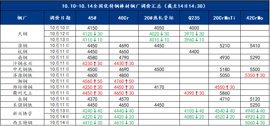 10.10-10.14全國(guó)主要優(yōu)特鋼廠調(diào)價(jià)情況如下:本期共有14家鋼廠發(fā)布調(diào)價(jià)信息,累計(jì)發(fā)布調(diào)價(jià)信息17次。本周鋼廠調(diào)價(jià)漲跌互現(xiàn),下周應(yīng)持續(xù)關(guān)注消費(fèi)需求及鋼廠檢修的影響。