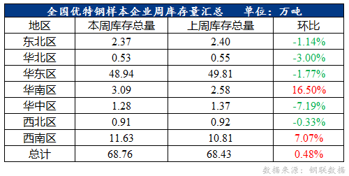 全國優(yōu)特鋼棒材樣本總庫存68.76萬噸,環(huán)比上升0.33萬噸,增幅0.48%。