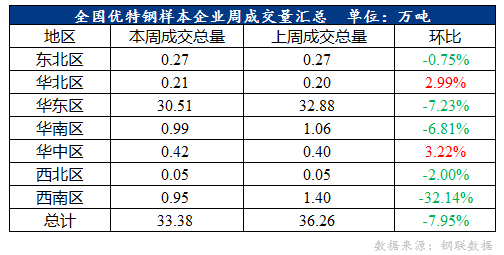 全國優(yōu)特鋼棒材樣本企業(yè)成交量33.38萬噸,環(huán)比下降2.88萬噸,降幅7.94%。