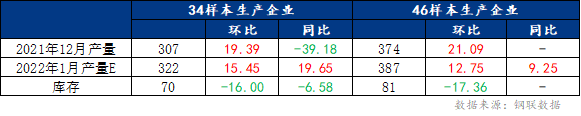 1月優(yōu)特鋼廠(34家樣本)棒材排產(chǎn)322萬噸,環(huán)比增加15.45萬噸,同比增19.65萬噸;