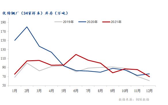 截止到12月31日,優(yōu)特鋼鋼廠(34家樣本)總庫(kù)存為70萬噸,環(huán)比降16萬噸,同比降6,58萬噸;優(yōu)特鋼鋼廠(46家樣本)總庫(kù)存為80.52萬噸,環(huán)比降17.35萬噸。