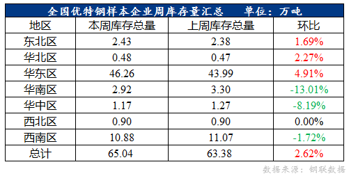 全國優(yōu)特鋼棒材樣本總庫存65.04萬噸,環(huán)比上升1.66萬噸,增幅2.62%。