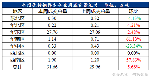 全國優(yōu)特鋼棒材樣本企業(yè)成交量31.66萬噸,環(huán)比上升1.7萬噸,增幅5.66%。