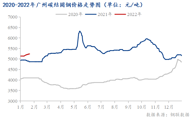 價格方面:如圖所示,截止至1月25日,以湘鋼、韶鋼為例廣東市場碳結(jié)圓鋼主流價格在5240元/噸,較月初上漲100元/噸;較去年同期相比上漲370元/噸,較2020年同比上漲1140元/噸;不難看出,往年春節(jié)前1月鋼價處于節(jié)前正常回落階段,尤其是2021年在2020年12月份大漲后快速回落;反觀今年,1月份鋼價在2021年11月份大跌后觸底反彈以及年前情緒面影響下不降反漲,致使廣東優(yōu)特鋼價格縱向同比以上漲態(tài)勢態(tài)勢高位運行,相對擠壓了節(jié)后復(fù)工鋼價上漲空間。
