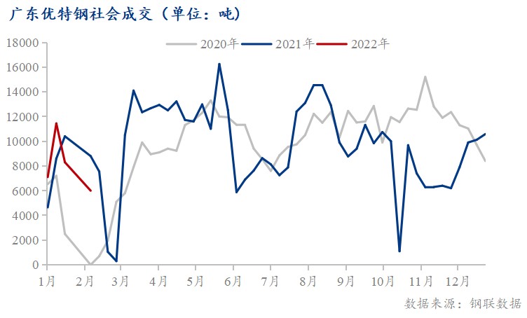 成交方面:從春節(jié)前的社會成交方面來看,本地供需基本停滯。目前廣東優(yōu)特鋼下游企業(yè)已陸續(xù)放假,貿(mào)易商收款收貨,加之物流停運、各地春節(jié)期間疫情管控措施出臺,部分終端企業(yè)提前放假。廣東市場商家普遍為謹(jǐn)慎看漲心態(tài),認(rèn)為節(jié)后短期內(nèi)價格有一定的上漲空間整體價格走勢為先揚后抑,具體情況還要關(guān)注下游開工復(fù)工時間。多數(shù)終端企業(yè)計劃于2月8日開工,少數(shù)春節(jié)進(jìn)行調(diào)休,大年初八復(fù)工。預(yù)計春節(jié)后成交短期內(nèi)向好發(fā)展。