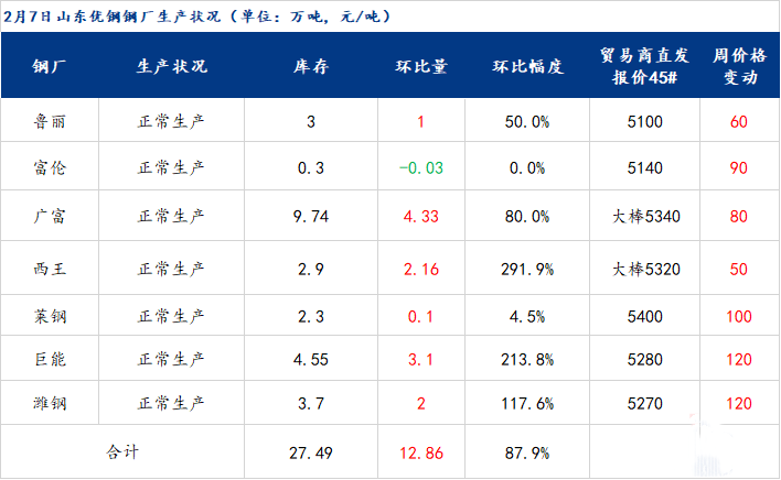 2月7日山東優(yōu)特鋼廠棒材總庫存27.49萬噸,較節(jié)前增加12.86萬噸,增幅88%,較去年春節(jié)后庫存減少3萬噸。