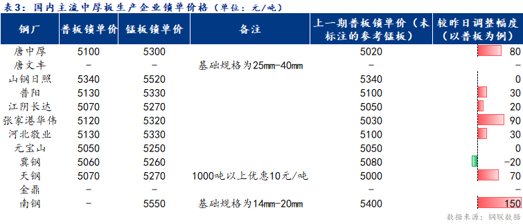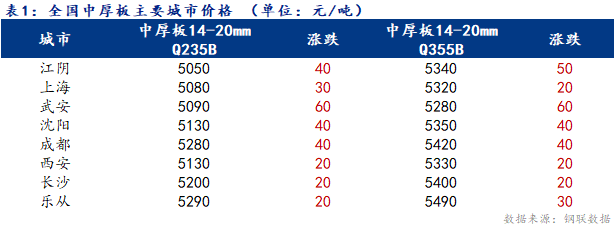 今日國內(nèi)主流中厚板廠一單一議價(jià)格漲勢較強(qiáng),其中華北地區(qū)主流漲幅在20-80元/噸,個(gè)別鋼廠下調(diào)20元/噸,華東地區(qū)漲勢較強(qiáng),漲幅在80-150元/噸。