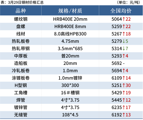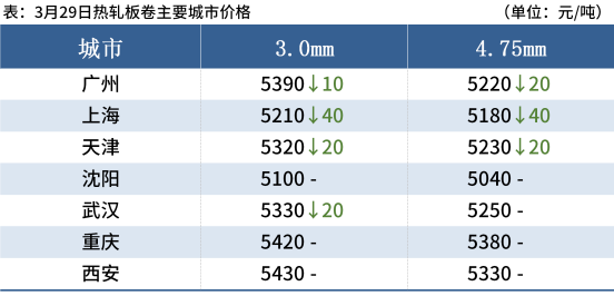 熱軋板卷:3月29日,全國24個主要城市4.75mm熱軋板卷均價5279元/噸,較上個交易日下跌5元/噸。當(dāng)前受疫情干擾,上下游生產(chǎn)需求均受到限制,呈現(xiàn)供需雙弱格局,行情波動較小,但市場認(rèn)為需求在逆周期下的情況,將會延遲釋放。對于后期行情多數(shù)看漲,挺價意愿明顯,認(rèn)為待疫情逐步緩解后市場需求或迎來集中性釋放。