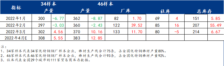 表三:2021-2022年優(yōu)特鋼棒材(46家樣本)產(chǎn)量(單位:萬(wàn)噸)