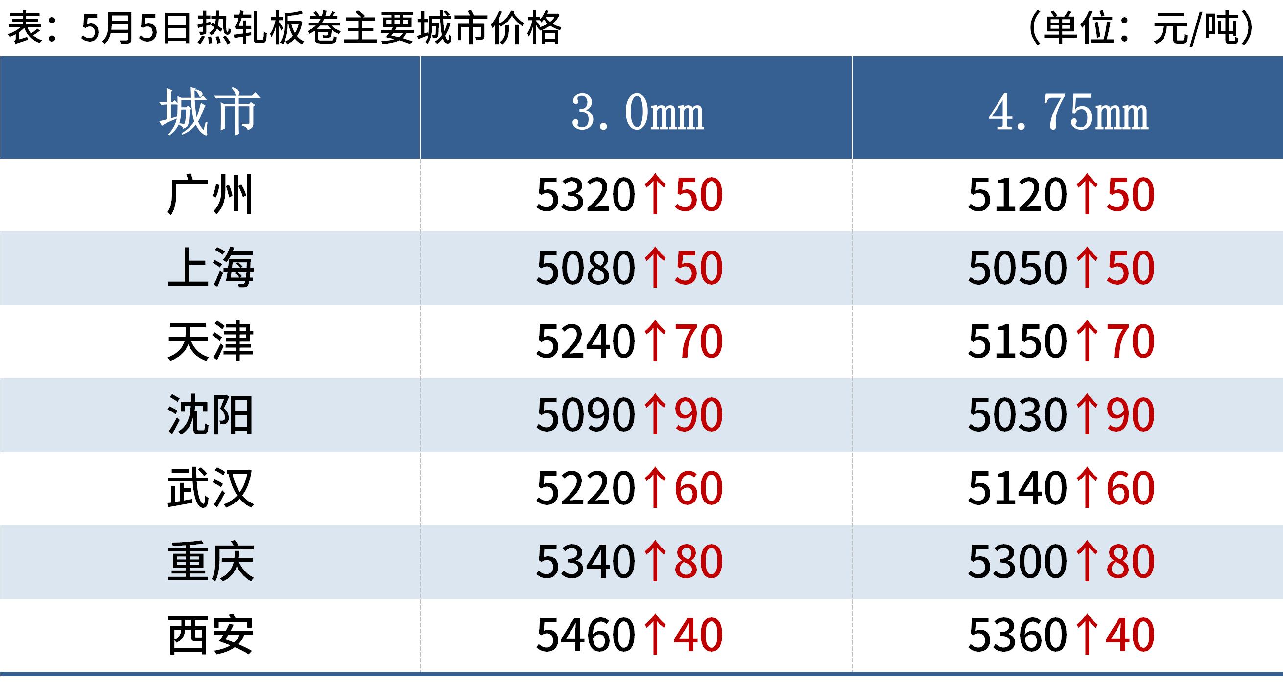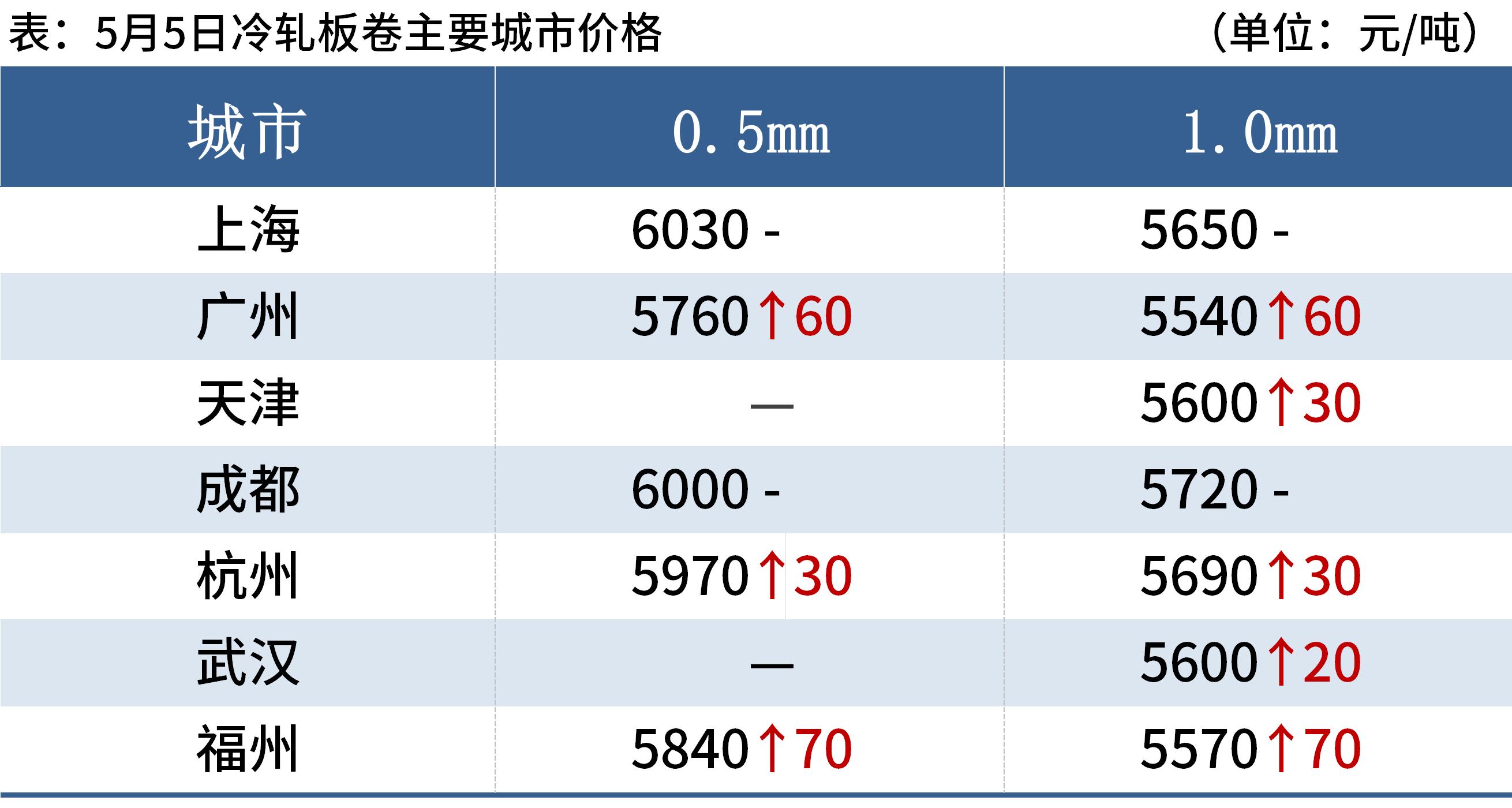 冷軋板卷:5月5日,全國24個主要城市1.0mm冷卷均價5676元/噸,較上個交易日上漲18元/噸。據(jù)部分貿(mào)易商反饋,假期過后市場上存在部分補(bǔ)庫現(xiàn)象,現(xiàn)貨市場交投氛圍較為活躍,再加上期貨盤面整體偏強(qiáng)運(yùn)行,今日整體成交表現(xiàn)較好。鋼廠方面,據(jù)悉,部分鋼廠預(yù)計本月檢修,計劃檢修時間6-10天。庫存方面,據(jù)Mysteel不完全統(tǒng)計,現(xiàn)冷軋鋼廠庫存44.13萬噸,周環(huán)比增加0.53萬噸,社會庫存139.41萬噸,周環(huán)比增加4.36萬噸,周消費(fèi)量83.31萬噸,環(huán)比減少1.33萬噸。綜合來看,故預(yù)計6日國內(nèi)冷軋板卷價格或?qū)⒄鹗庍\(yùn)行。