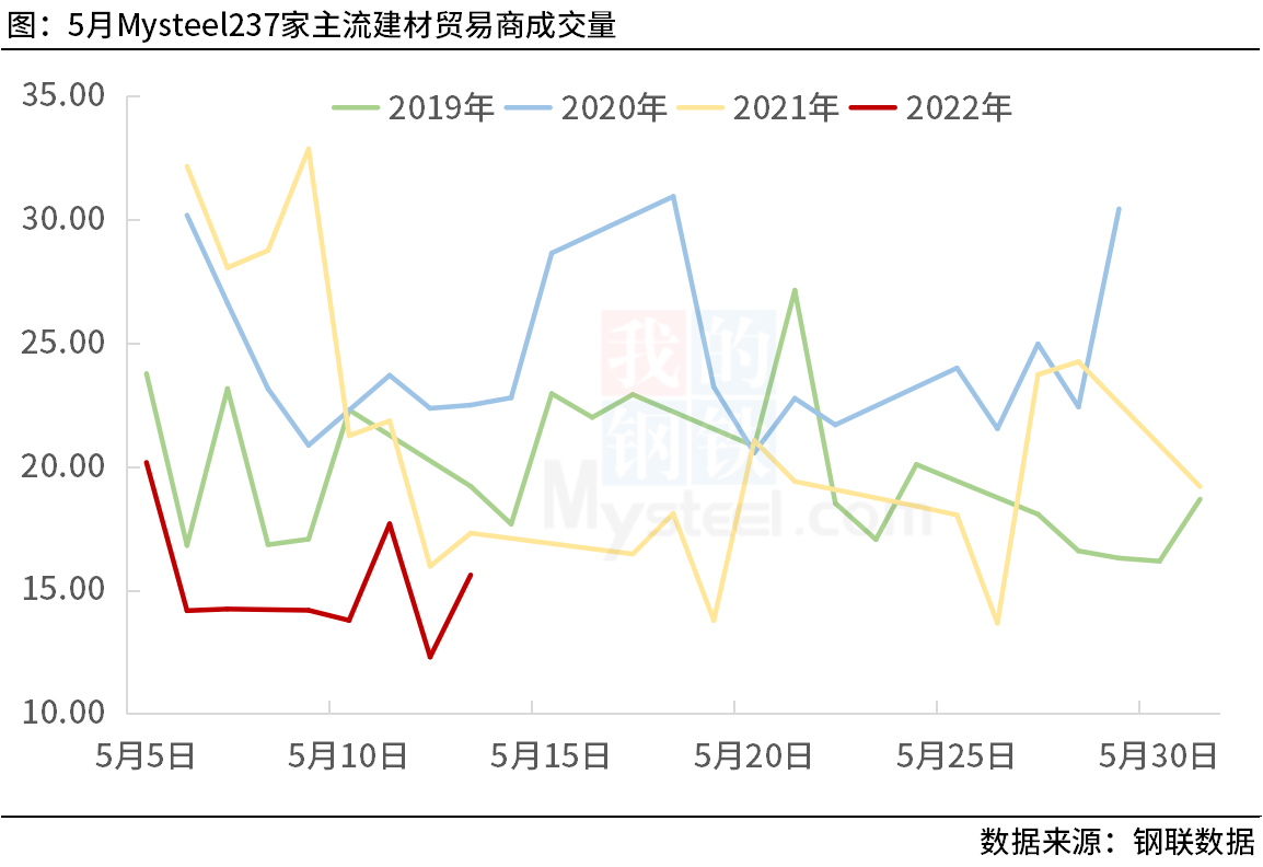 再看鋼鐵行業(yè),據(jù)上海鋼聯(lián)調(diào)研,5月5日-13日,237家主流建材貿(mào)易商日均成交量為15.27萬噸,較去年同期下降近4成;上周鋼材五大品種表需較去年同期下降近17%;506家混凝土企業(yè)產(chǎn)能利用率同比降超10個(gè)百分點(diǎn)。
