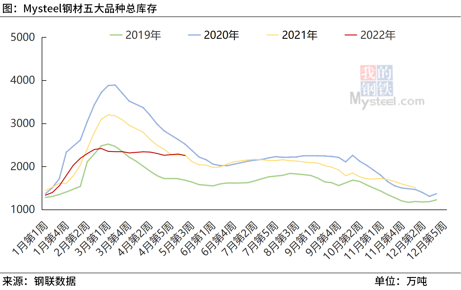 徐向春:庫存是反映鋼材供需關(guān)系的同步指標(biāo),二季度歷來是庫存快速去化的階段,但是今年一反常態(tài)。鋼材五大品種庫存總庫存3月3日見到2417.92萬噸的高點(diǎn),5月12日為2254.74萬噸,10周的時(shí)間庫存僅降163.18萬噸,降幅為6.75%,而往年同期庫存降幅達(dá)30-35%,去化緩慢的主要原因仍是疫情導(dǎo)致的需求停滯。
