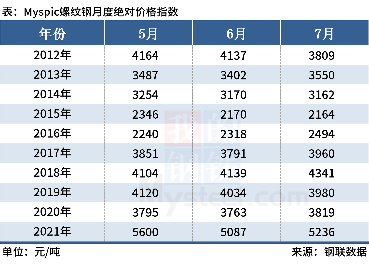 從最近十年的市場表現(xiàn)來看,Myspic螺紋鋼月度絕對(duì)價(jià)格指數(shù)在六月份價(jià)格3次上漲,7次下跌;七月份7次上漲,3次下跌。三季度的價(jià)格表現(xiàn),往往具有“淡季不淡”的戲劇性效果。尤其對(duì)今年而言,疫情得到控制后,鋼材需求會(huì)有一個(gè)集中釋放,這將更為“淡季不淡”增添的一抹亮麗色彩。