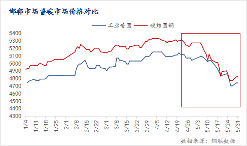 邯鄲市場(chǎng)價(jià)格方面(以新興鑄管為例):截止至5月31日工業(yè)普?qǐng)A市場(chǎng)價(jià)格為 4700元/噸較上半年度高點(diǎn)5090元/噸下跌390元/噸,降幅為7.7%。碳結(jié)圓鋼市場(chǎng)價(jià)格為4790元/噸較上半年度價(jià)格高點(diǎn)5300元/噸下跌510元/噸,降幅為9.6%,且截止發(fā)稿日普碳均已跌破年前價(jià)格!