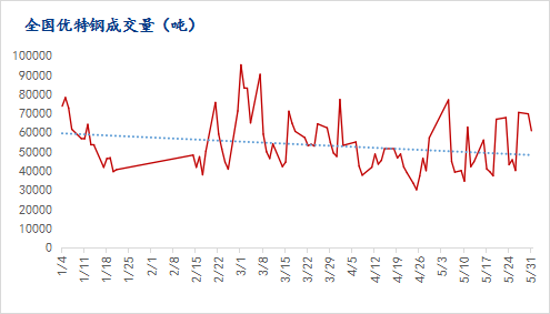 據(jù)調(diào)研樣本企業(yè)了解,全國(guó)優(yōu)特鋼成交量屬于下行趨勢(shì)。