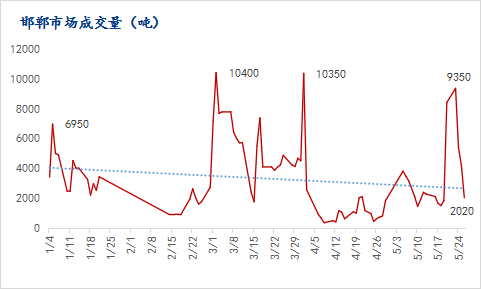 (1)1-5月全國(guó)成交月均量約為950191噸,邯鄲市場(chǎng)1-5月成交月均量約為56255噸;占全國(guó)均量的5.9%。