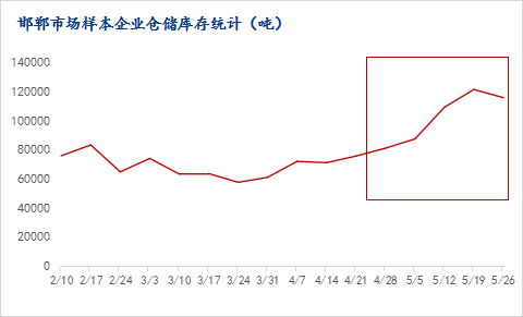 三、庫(kù)存方面 據(jù)了解,即4月該地區(qū)疫情爆發(fā)開始,物流無(wú)法正常運(yùn)輸,在資源鋼廠持續(xù)到庫(kù)的情況下商戶倉(cāng)儲(chǔ)庫(kù)存不斷增量,由圖4可見,4-5月庫(kù)存量上升明顯,5月下半旬到達(dá)高位。