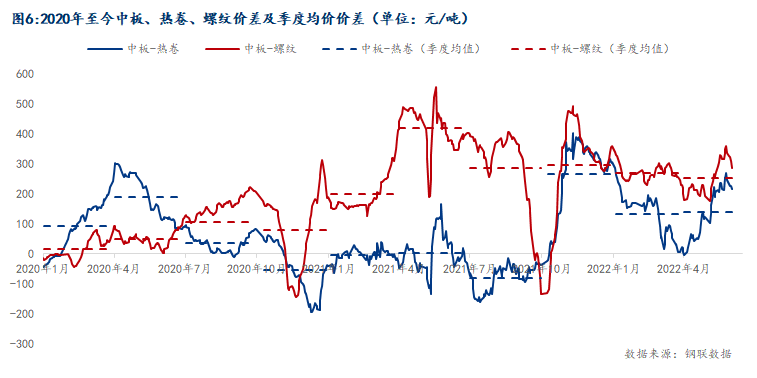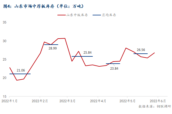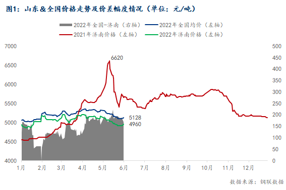 市場(chǎng)進(jìn)入常規(guī)淡季,受南方雨水及臺(tái)風(fēng)預(yù)期增加,粗鋼整體需求預(yù)期減弱;原料供應(yīng)及鋼廠利潤(rùn)將會(huì)給與價(jià)格較強(qiáng)支撐作用,整體價(jià)格抗跌性加強(qiáng);供需方面,南方來(lái)看,長(zhǎng)三角需求總體預(yù)期逐漸恢復(fù),滯后性需求支撐較大,終端需求匹配不斷恢復(fù)的終端利潤(rùn),市場(chǎng)需求從剛性需求逐漸轉(zhuǎn)為彈性需求,價(jià)格整體支撐性較五月份將改善;北方來(lái)看,前期滯壓庫(kù)存疊加鋼廠目前高產(chǎn)量,北材南下資源將繼續(xù)增發(fā),山東市場(chǎng)中板資源競(jìng)爭(zhēng)將不斷加劇;不僅如此,從粗鋼產(chǎn)量壓減工作各省完成情況來(lái)看,河北為首的北方區(qū)域完成較好,山東地區(qū)則明確要求2022年粗鋼全年產(chǎn)量不超過(guò)7650萬(wàn)噸,后期北方資源生產(chǎn)壓力較小。
