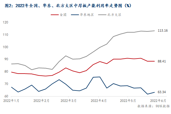 全國(guó)中厚板鋼廠產(chǎn)能利用率目前為88.41%。其中,華東地區(qū)產(chǎn)能利用率為63.34%,北方大區(qū)(含東北、華北、西北地區(qū))產(chǎn)能利用率為113.16%。