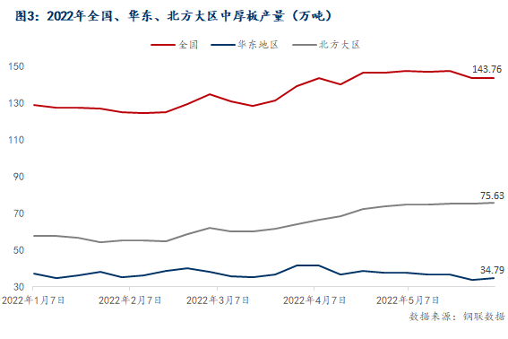 全國(guó)中厚板產(chǎn)量目前為143.76萬(wàn)噸。其中,華東地區(qū)鋼廠產(chǎn)量為34.79萬(wàn)噸,北方大區(qū)(含東北、華北、西北地區(qū))鋼廠產(chǎn)量為75.63萬(wàn)噸。