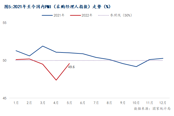 據(jù)國(guó)家統(tǒng)計(jì)局?jǐn)?shù)據(jù)顯示,5月國(guó)內(nèi)PMI(采購(gòu)經(jīng)理人指數(shù))為49.6%,較上月上升2.2%;較去年同期偏低1.4%。