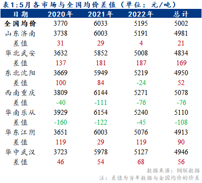 據(jù)鋼聯(lián)數(shù)據(jù)對(duì)各區(qū)域主流市場(chǎng)及全國(guó)均價(jià)的5月價(jià)差數(shù)據(jù)分析:山東、東北今年價(jià)格較全國(guó)平均水平有所抬升,華北、華南、華東、華中較全國(guó)平均水平有所下降;