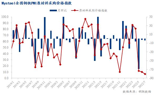 7月份原材料采購價格指數(shù)6.7,環(huán)比下降3.4個百分點(diǎn),為近五年最低點(diǎn),表明鋼廠生產(chǎn)積極性持續(xù)下滑,備貨意愿不足。截止7月29日,Mysteel數(shù)據(jù)顯示,Myipic綜合指數(shù)為113.99,環(huán)比上月下降9.32%,同比去年下跌44.77%。其中進(jìn)口礦同比下跌42.78%,國產(chǎn)礦同比下跌47.97%。