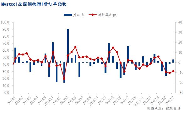2022年7月份全國鋼鐵行業(yè)PMI為34.5%,環(huán)比回落2.7個百分點(diǎn),創(chuàng)下自2020年3月份以來新低。分指標(biāo)來看,本月各分項(xiàng)指數(shù)全線低于榮枯線下方,其中產(chǎn)出指數(shù)也降至近3年低點(diǎn),新訂單指數(shù)略有回升,但新出口訂單指數(shù)明顯下滑,顯示7月份國內(nèi)鋼鐵行業(yè)在供需疲弱中逐步改善。具體來看,7月份國內(nèi)鋼材價格呈現(xiàn)超跌后反彈態(tài)勢運(yùn)行,首先受美聯(lián)儲加息以及需求下降的悲觀預(yù)期打壓,國內(nèi)鋼材價格大幅回落,尤其在中旬市場情緒一致性極度悲觀,導(dǎo)致現(xiàn)貨價格深度回調(diào),創(chuàng)下近2年來低點(diǎn)。不過隨著情緒的釋放以及投機(jī)需求逐步入場,后半月市場價格迎來震蕩反彈。面對即將到來的8月份,國內(nèi)鋼價能否繼續(xù)反彈,行業(yè)基本面能夠迎來好轉(zhuǎn),下面筆者從PMI各項(xiàng)指數(shù)進(jìn)行分析解讀。