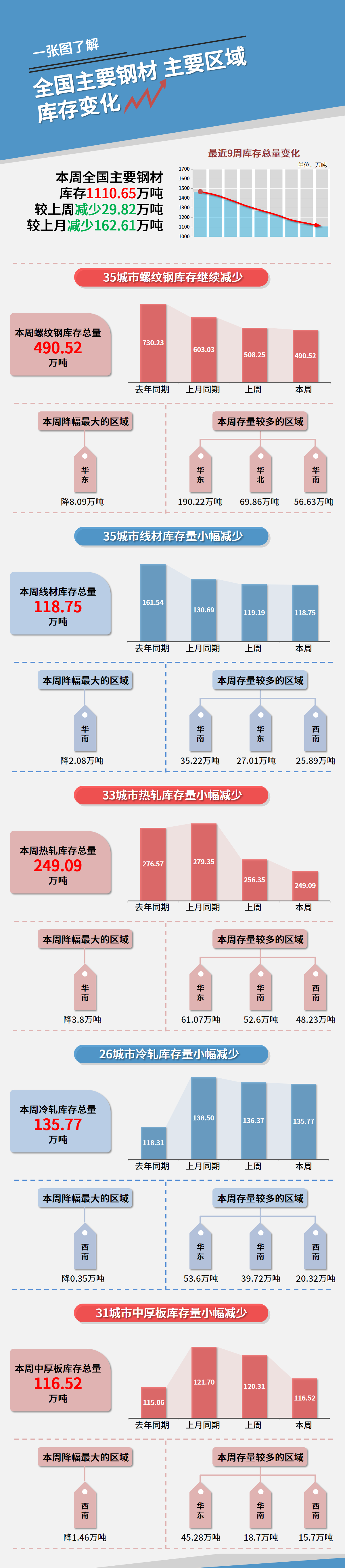 本周五大品種總庫(kù)存1615.34萬(wàn)噸,較上一期減少13.34萬(wàn)噸。供應(yīng)方面,本周五大鋼材品種產(chǎn)量環(huán)比增幅顯著,當(dāng)前鋼廠正為后期需求恢復(fù)做準(zhǔn)備,復(fù)產(chǎn)積極性提升,預(yù)計(jì)后期產(chǎn)量仍有上行空間。需求方面,本周五大鋼材品種周消費(fèi)量環(huán)比上行,終端需求略有好轉(zhuǎn)。庫(kù)存方面,本周社庫(kù)延續(xù)去化,但幅度明顯收窄的主因在于現(xiàn)階段需求尚未啟動(dòng),難以消化供應(yīng)增量的大批資源流入;而廠庫(kù)累增的主因在于區(qū)域內(nèi)供應(yīng)增量擴(kuò)張,入庫(kù)節(jié)奏明顯快于出庫(kù)。綜合來(lái)看,在供應(yīng)增量超預(yù)期而需求尚未明朗的背景下,當(dāng)前庫(kù)存去化壓力凸顯,預(yù)計(jì)后期庫(kù)存將開(kāi)始出現(xiàn)累庫(kù)。