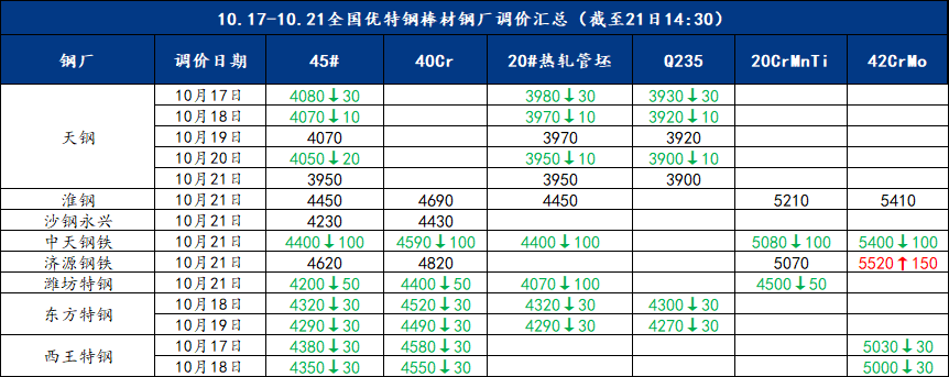 全國優(yōu)特鋼棒材鋼廠調(diào)價(jià)匯總(10.17-10.21)