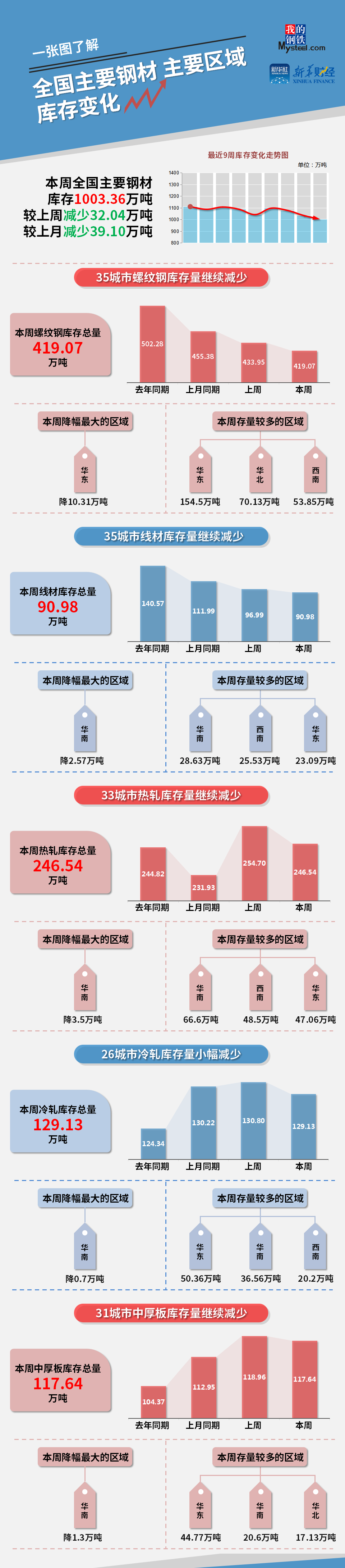 本期(10月21日-10月27日),全國主要鋼材社會(huì)庫存1003.36萬噸,較上一期減少32.04萬噸,較上月同期減少39.10萬噸;螺紋鋼庫存419.07萬噸,較上一期減少14.88萬噸。