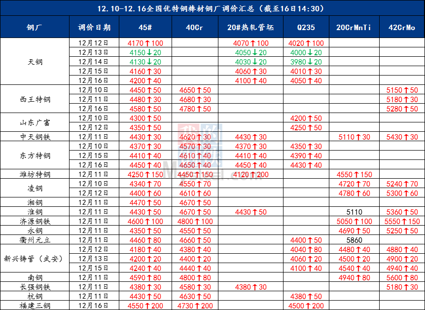 本周全國(guó)優(yōu)特鋼價(jià)格行情及鋼廠調(diào)價(jià)匯總